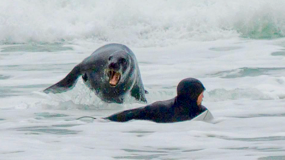New Zealand lensman Rambo Estrada captures a contentious encounter between surfers and sea lions in New Zealand. Luckily, nobody was injured.