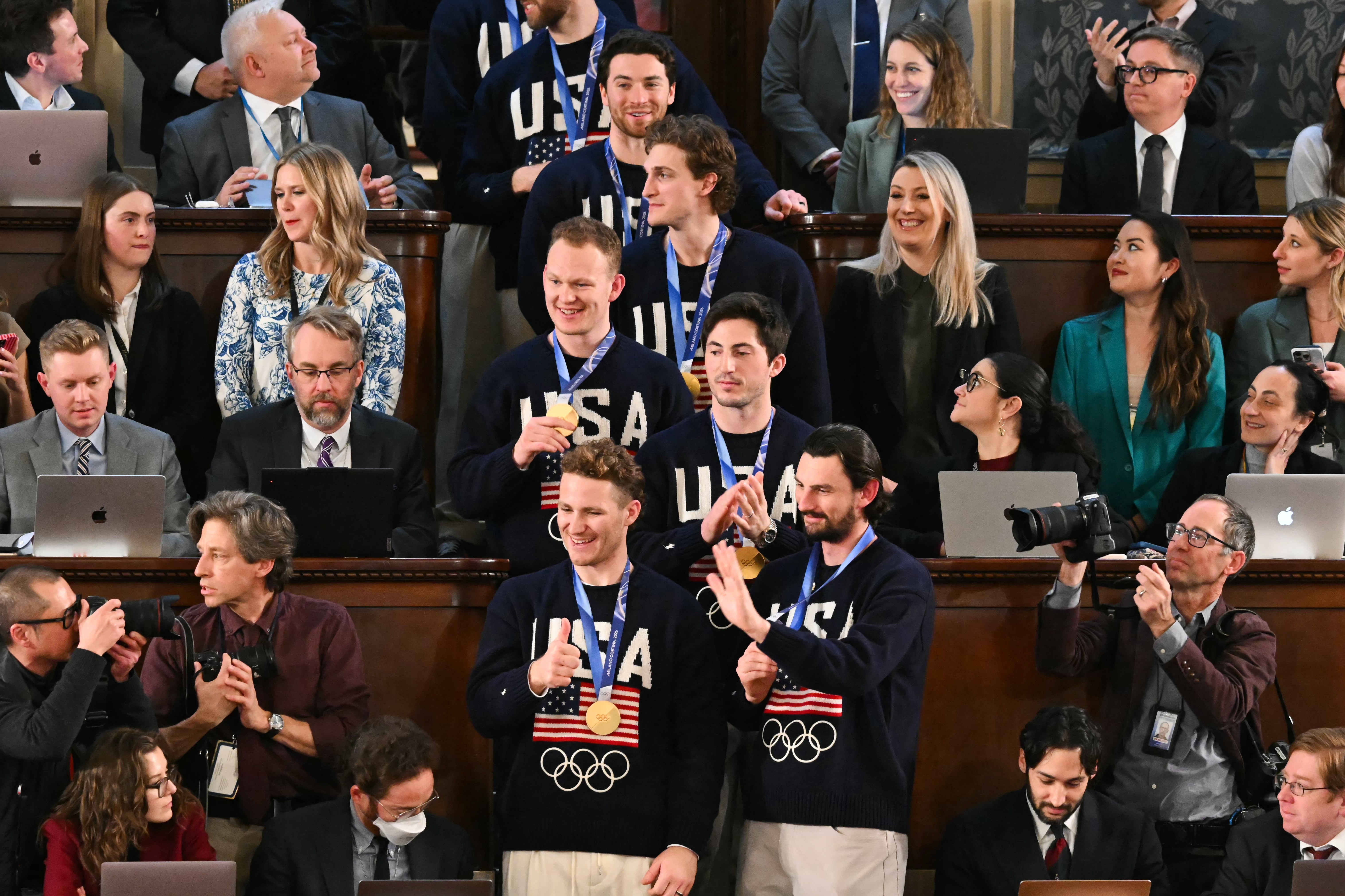 The gold-medal-winning U.S. men's Olympic hockey team visited President Donald Trump at the White House before attending his State of the Union address.