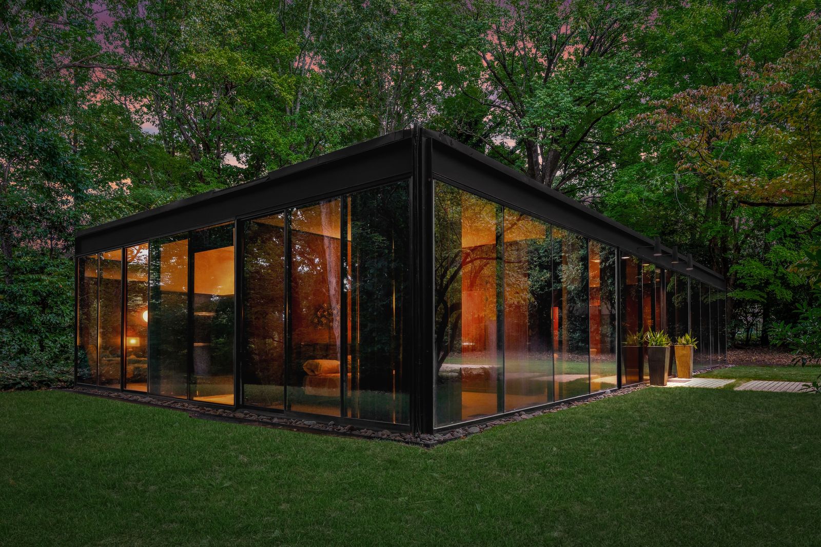 Brick floors and teak built-ins run throughout the 1960 residence, which is wrapped in floor-to-ceiling glazing.
