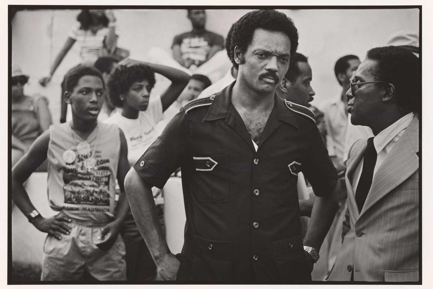 The Rev. Dr. Martin Luther King Jr., second from right, alongside Jesse Jackson, at center holding a piece of paper, at Greater Mount Hope Baptist Church in Chicago in 1966.